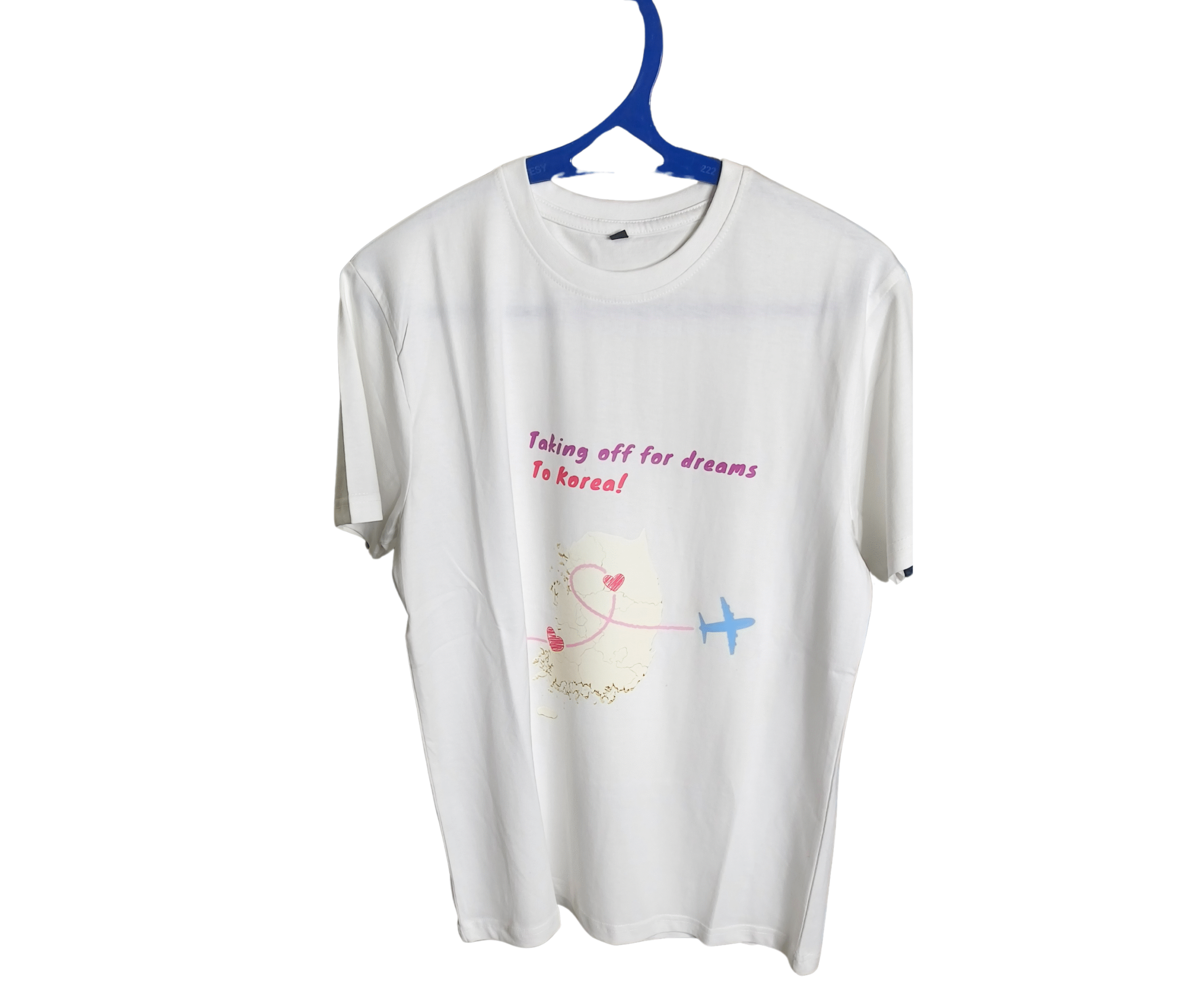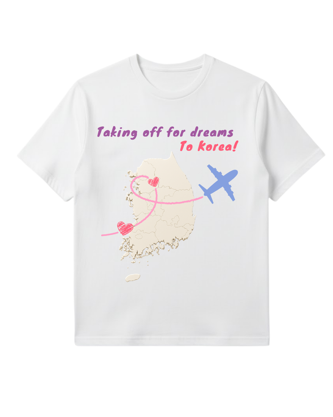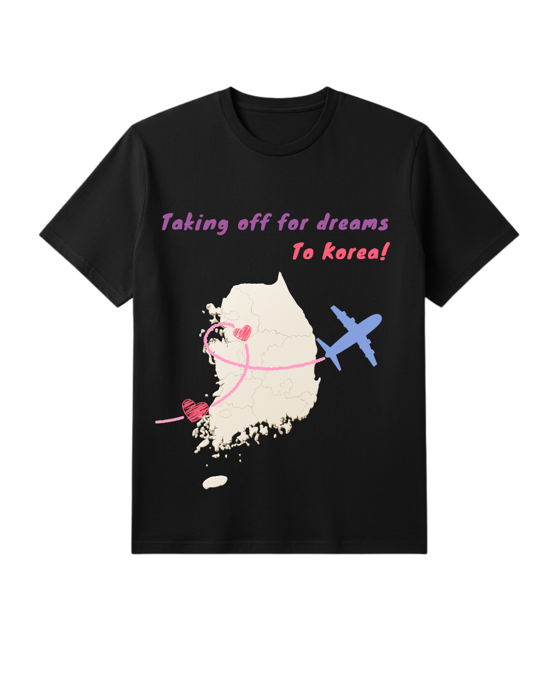 This tee features a minimal map-line of South Korea with a heart-path and airplane trail, symbolizing the journey of dreamers heading toward Korea. Designed for students, travelers, K-culture lovers, and anyone whose heart is already in Seoul.